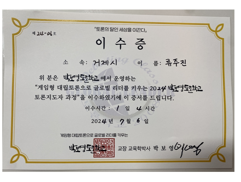 게임형 대립토론이 곳곳에 전파되어 우리 아이들이 건강하고 세계적인 리더로 자라나도록 작은 손이라도 보탬이 되도록 노력하겠습니다 ^^