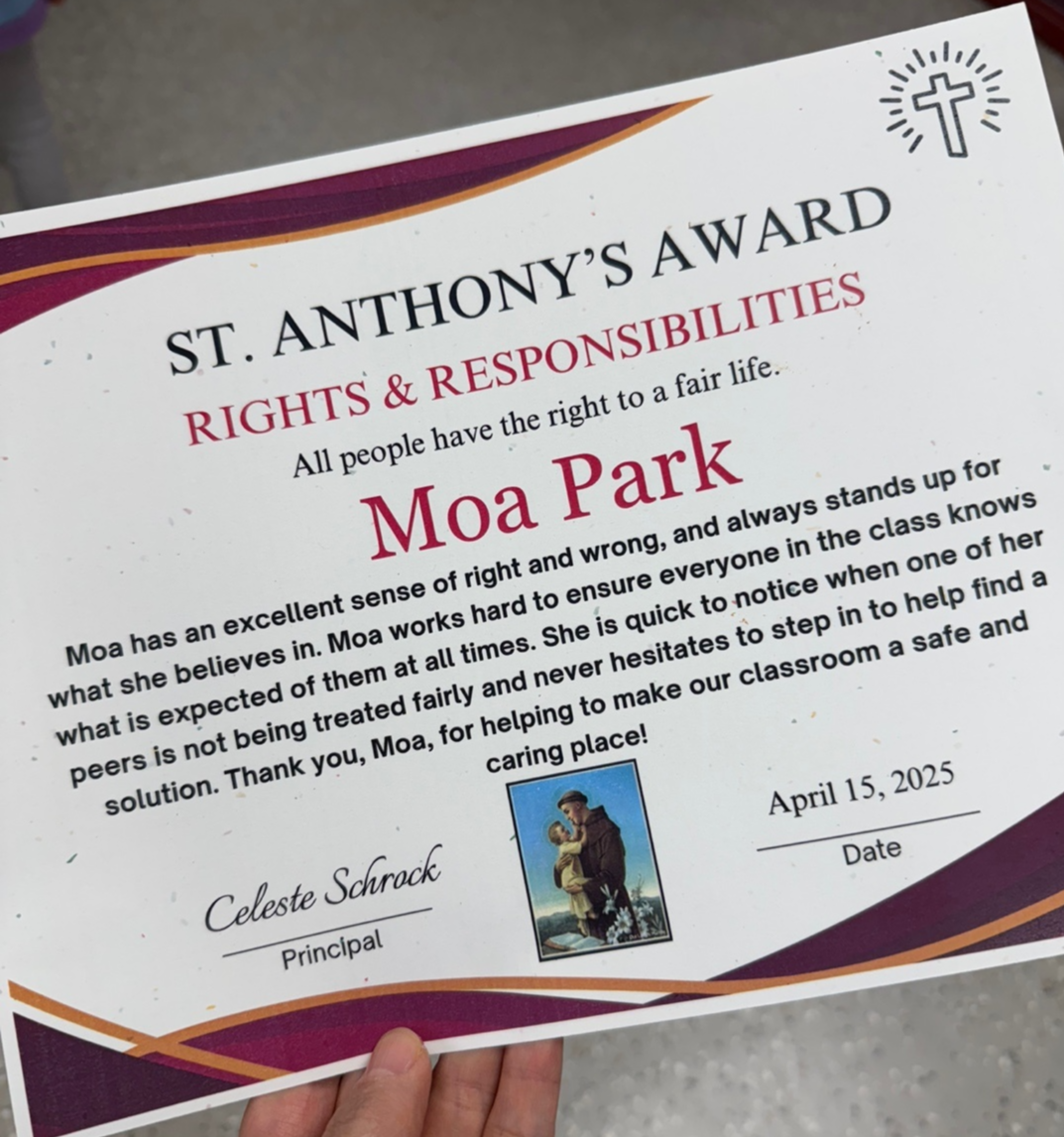 성 안토니오 상은 ‘공정한 삶의 권리’를 주제로, 학생이 정의감과 책임감을 실천한 점을 칭찬하고 격려하는 상입니다.