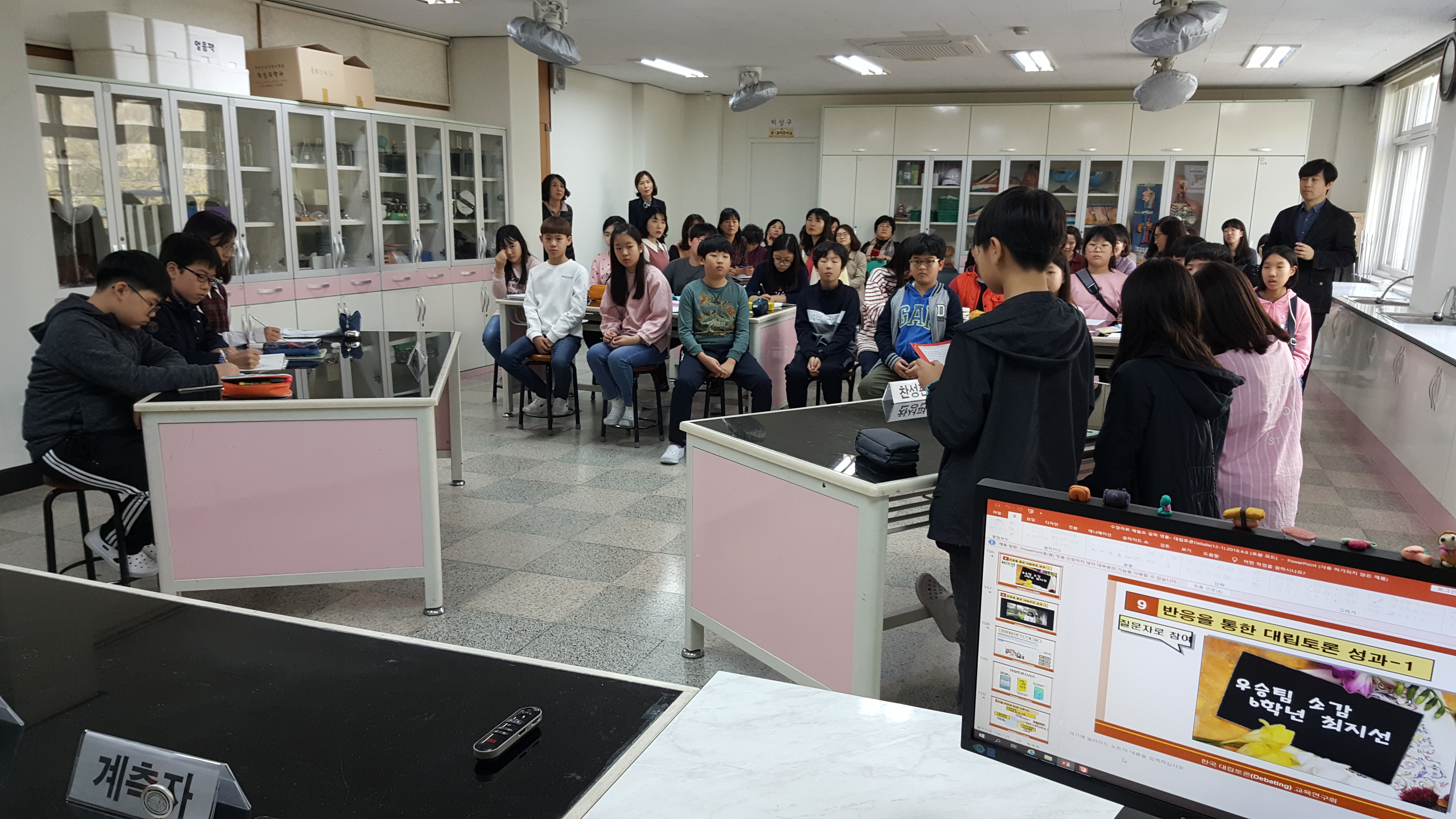 이시간에 6학년2반의 대립토론 하는 모습을 선생님들이 참관하고 이어서 강의를 들었다.