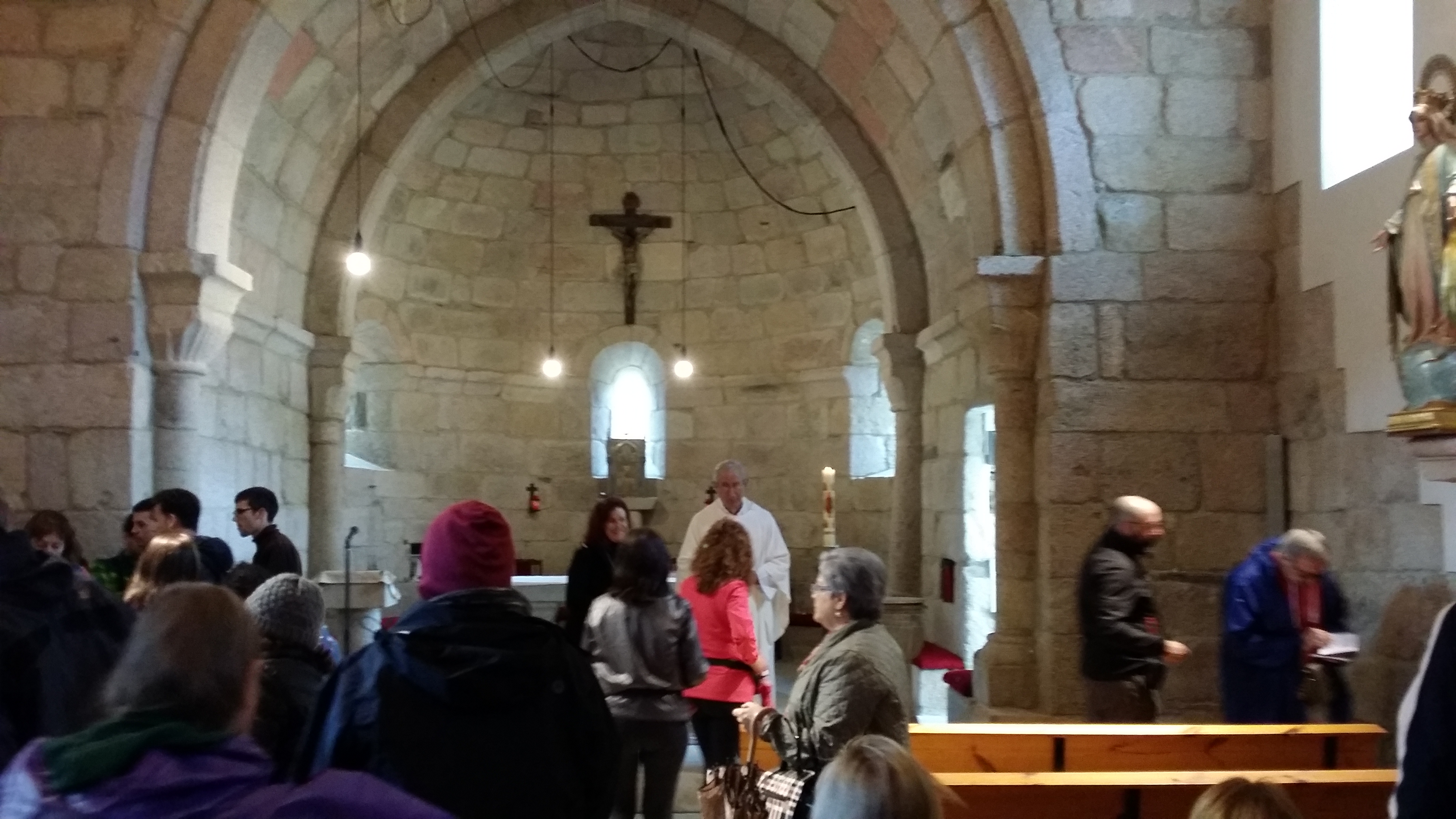하지만 안심할 때는 아니라고 본다. 교만해서는 안 된다. 주님은 아시겠지만 주님은 늘 가까이 하시겠지만 인간인 나로써는 마지막 주일에 마음을 다잡는다. 더 이상 흥분하지 말아야 하겠다. 이런 마음을 가지고 주일미사 (7:30)에 참여한다. 비가 오는데 찾아간 성당, 가면서 아들이 짜증도 났었다. 미사시간을 중요시 여겨 알아보려고 갔었는데 소통의 문제가 생겨서 점심시간에 아들과 작은 충돌이 있었으니 지금 생각해 보니 만약에 지금과 같이 비가 많이 오는 상황에서 아들이 미사시간을 알아보지 않았으면 어떻게 했을까? 비도 많이 오는데… 아들이 미사를 중요시함은 더욱 감사하게 생각되었다. 이 모든 것이 나로 하여금 내가 잘못했다고 말하도록 만든다. 나는 미사 전에 아들과 악수를 하며 화해를 하고 미사에 참여하였다. 미사 중에 순례자들을 위해 Sarria 신부님께서 축성도 해주시고 미사 후에는 까미노 친구들 다 나오라고 해서 제대를 중심으로 모여 놓고 일일이 어느 나라에서 왔느냐? 하며 물어보시며 친절하게 맞이 해 주신다. South Korea 라고 하니 “안녕하세요, 감사합니다.”를 한국말로 하시면서 환영해 주시고 축성해 주셨다. 미사 후 나와 만남의 악수를 하시며 “반갑습니다 안녕하세요”를 한국말로 하시며 아들과 함께 왔다고 하니 불러서 사진도 함께 찍으시며 잘 마치라고 안수해 주셨다. 감사드립니다.