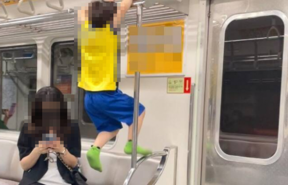 해당 게시글에는 한 아이가 서울 5호선 지하철 객실에서 신발을 벗고 의자 위 구조물에 매달려 노는 모습의 사진이 담겼다.